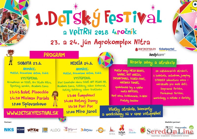 Výstavisko Agrokomplex bude patriť najmä deťom od 10:00 do 20:00 hod. Všetky informácie nájdete na stránke www.detskyfestival.sk. Výhodnejšie rodinné vstupenky si môžete kúpiť v sieti Ticketportal.1.